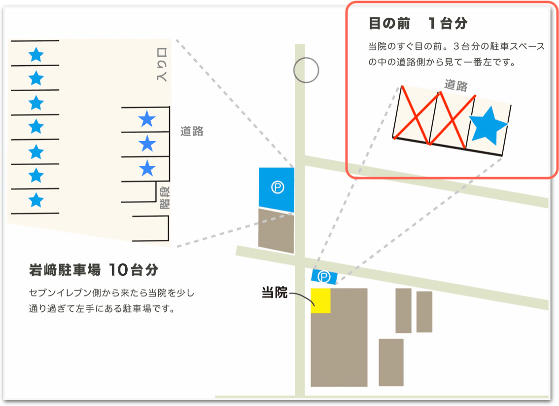 来院時、上記に車がありましたら第二駐車場(岩﨑駐車場)にお願いいたします。